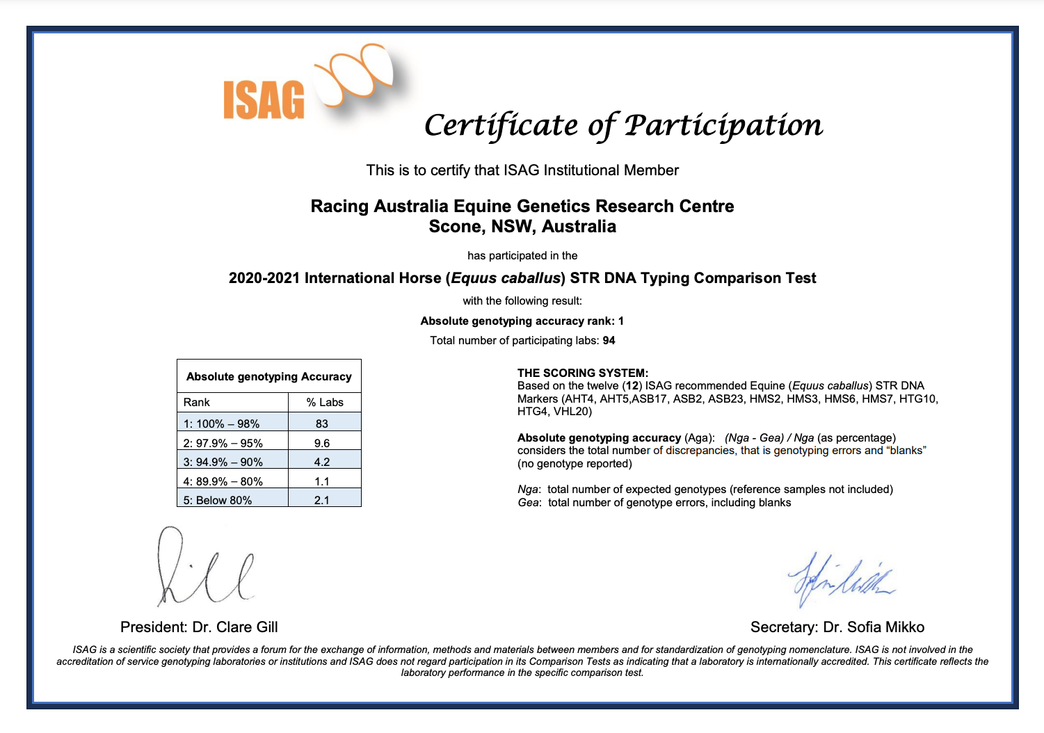 In 2021 Racing Australia participated in the International Horse STR DNA Typing Comparison Test and achieved rank 1 with 100% genotyping accuracy. Rank 1 is necessary to allow parentage verification of Thoroughbreds for the International Stud Book Committee.
